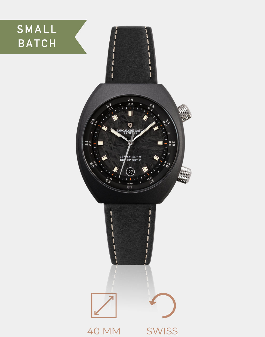 We worked with Meteorite hunters to source pieces from the Muonionalusta meteorite. We then sent it to our manufacturing partners in Switzerland who cut the rock and processed it to our specifications to be used in our watch dials. Due to the rarity of this material and the challenges in manufacturing, we can only make small batches at a time.